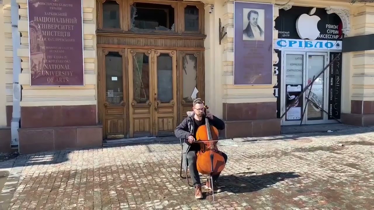 In the intervals between aerial alarms Kharkiv cellist Denis Karachevtsev performsthe nationalAnthem