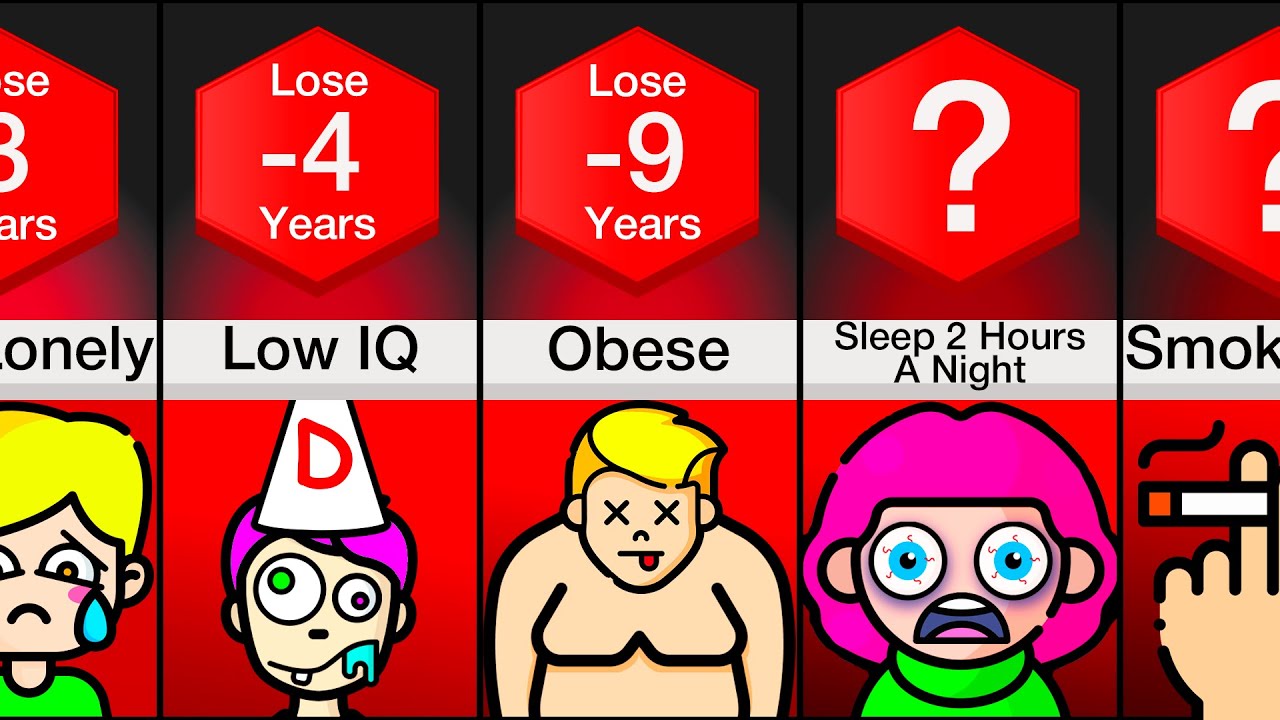 In this comparison video, we will show you how much earlier you would pass away if ___. Did you know that you are likely to pass away 2 years earlier if you oversleep? Or 10.5 years earlier if you smoke every day?! Watch this video to find out more!