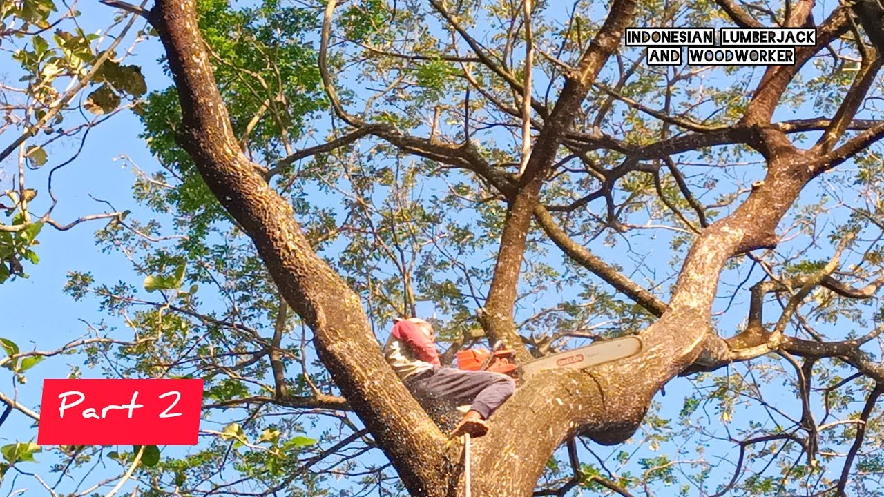 The process of felling 2 trembesi trees beside the house which is dangerous during rain and strong winds, using the Husqvarna 3120 XP chainsaw and Husqvarna 395 XP chainsaw, the best in class wood cutting machines by professional wood sensor operators.