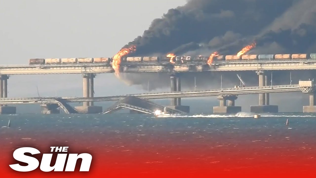 INFERNO rages on after massive explosion at crucial bridge linking Russia to Crimea.